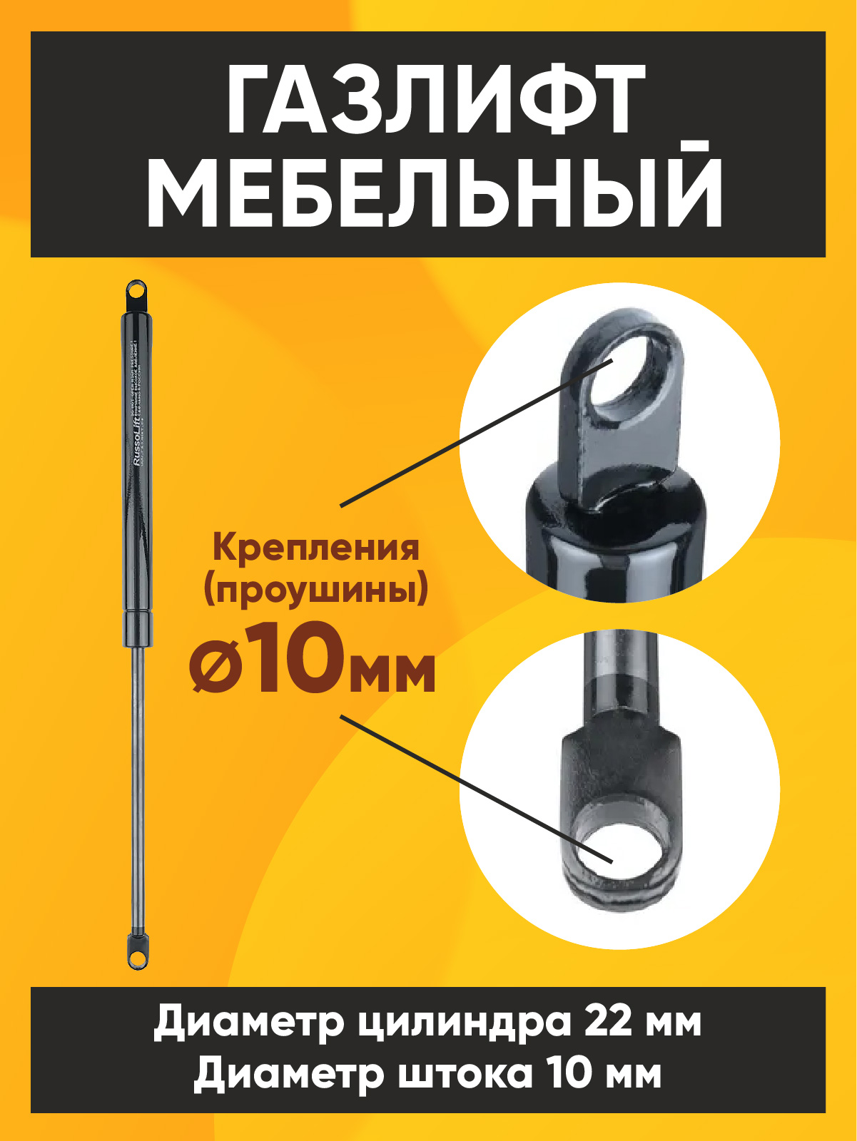 - Длина. Газлифты различаются по длине. Обычно длина указывается в мм. Длина – это длина газлифта в разложенном состоянии (с полностью вытянутым штоком) между центрами креплений.